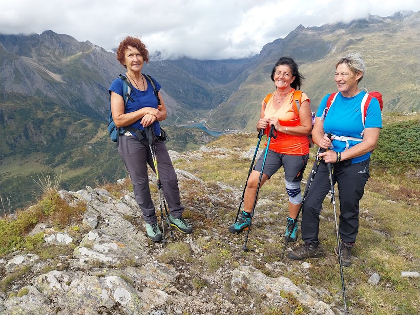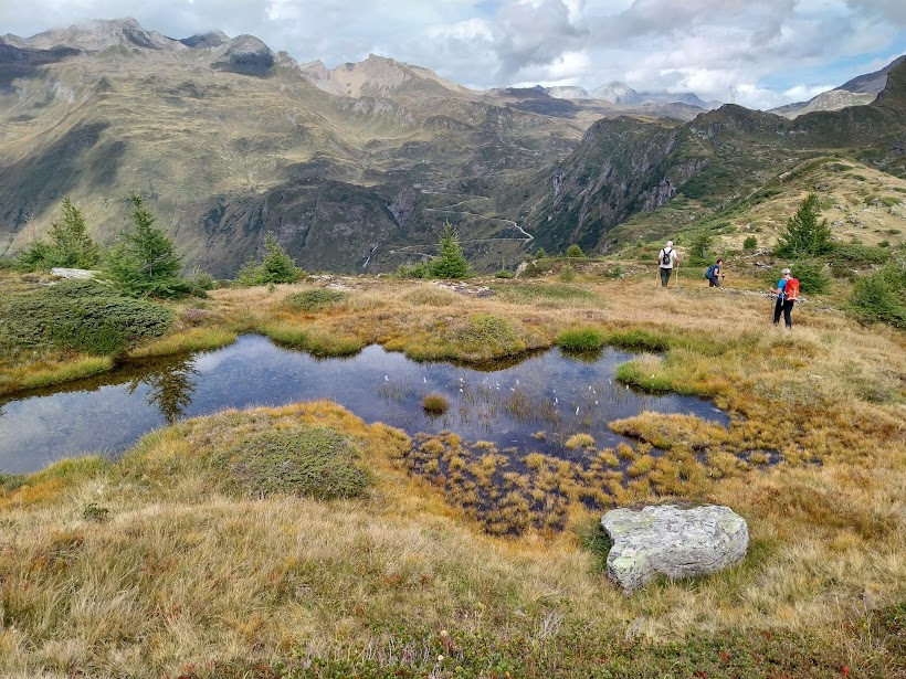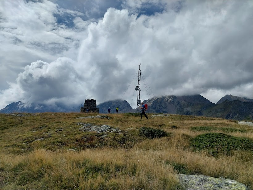 A due passi da qui, verso sud, c’è il Monte Castello, dove alcuni di noi erano già stati nel 2022, in una giornata di nebbie vaganti, fortunatamente accompagnati dal nostro presidente walser. Oggi la visibilità è discreta e vale la pena di godersi il bellissimo panorama che offre. Si decide di andarci, anche per supplire alla mancata salita oltre il Lago Nero. C’è una traccia, ma si sale con percorso libero puntando alla piccola torre, o meglio grande ometto in sasso, sulla vetta a quota 2218. Ci impieghiamo poco più di un quarto d’ora in questo ambiente bellissimo di verdi radure, vallette, piccoli stagni che la cartina battezza presuntuosamente “laghi”.